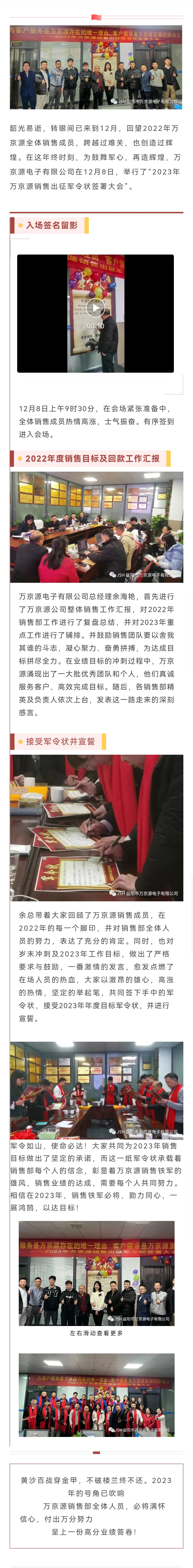 【概要描述】韶光易逝,轉眼間已來到12月,回望2022年萬京源全體銷售成員,跨越過難關,也創造過輝煌。在這年終時刻,為鼓舞軍心,再造輝煌,萬京源電子有限公司在12月8日,舉行了“2023年萬京源銷售出征軍令狀簽署大會”。